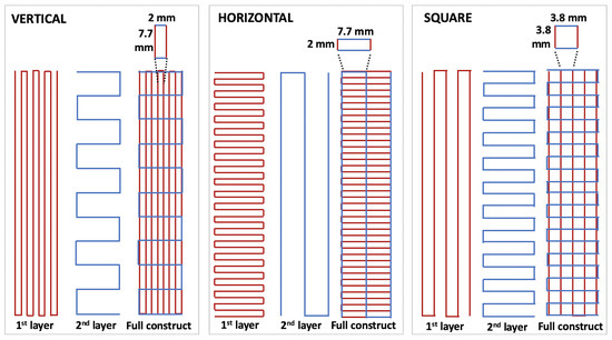 Representative images of the first two layers used for the fabrication of the 3D-printed membranes (10 layers total) with a vertical or horizontal orientation of the pores or membranes with square-shaped pores. For each orientation of the pores (vertical, horizontal, square), we show the distance between the filament used to create the geometries.
