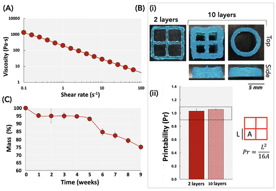 Characterization of the biomaterial ink and in vitro degradation of the 3D-printed scaffolds. (A) Viscosity of the ink CH–Gel–GG as a function of the shear rate, measured at 23 °C. (B) Evaluation of the printability of CH–Gel–GG ink. (i) Qualitative images of 10 mm × 10 mm square and 10 mm circular constructs printed in 2 or 10 layers are presented, viewed from the top and the side. (ii) Quantification of the printability (Pr value) of constructs made of 2 layers (full bars) or 10 layers (dotted bars) using the Pr value. (C) Degradation profile of CH–Gel–GG constructs in lysozyme at 37 °C for 9 weeks.