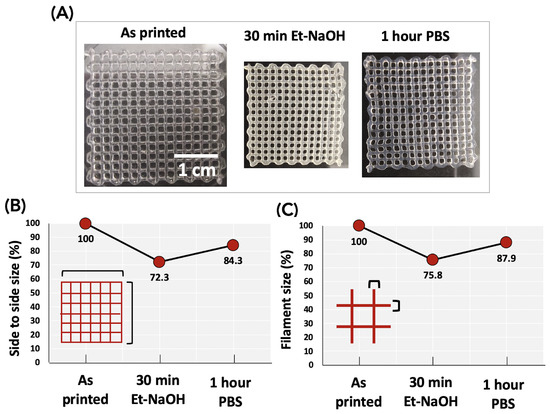 Shrinkage of 3D-bioprinted constructs after immersion in a gelling solution (ethanol and NaOH) for 30 min and subsequent swelling in PSB after 1 h. (A) Qualitative images of the shrinking and subsequent swelling processes. (B) Quantification of the variation in overall size (from side to side) of the membranes. (C) Quantification of the variation in filament size.