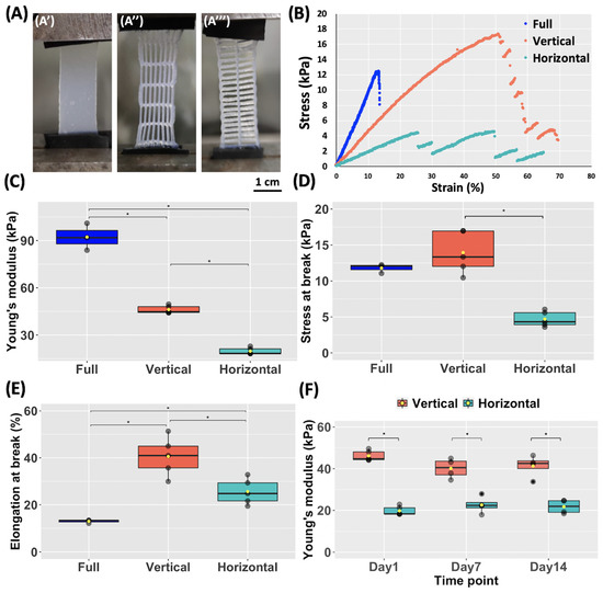 Uniaxial tensile testing of CH–Gel–GG membranes. (A) Photographs of (A’) a full membrane, (A″) a membrane with vertically oriented pores and (A‴) a membrane with horizontally oriented pores during the tensile test. (B) Representative uniaxial tensile stress—strain plots for full (blue), vertically (orange), and horizontally (green) pore-oriented membranes. (C) Average Young’s modulus calculated from the linear region of the stress–strain curve, average stress at break (D), and average elongation at the break (E) of membranes (n = 3 for full membranes and n = 5 for each group). (F) Average Young’s modulus of the vertically and horizontally pore-oriented membranes on day 1, day 7, and day 14 after printing and incubation in PBS at 37 °C (n = 5 for each condition on day 1, n = 4 for each condition at days 7 and 14). The boxes represent the central 50% of the data, the horizontal lines correspond to the median, and the whiskers represent the top 25% and the bottom 25% of the data. The yellow point represent the mean (* p < 0.05).