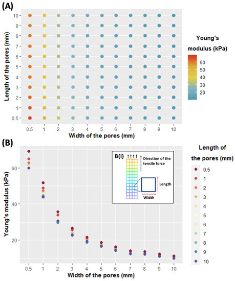 By knowing the Young’s modulus of the material, numerical modeling can be used to simulate tensile tests on membranes with a given geometry. Aiming to predict the elastic properties of more complex membranes with tunable local stiffness, we used this model to estimate the Young’s modulus of membranes with variable sizes of internal pores. In particular, we tuned the length and width of the pores (every mm, from 1 to 10 and including 0.5) and modeled uniaxial tensile tests in the direction of the length. On the contrary, regarding the thickness of the membrane, the Young’s modulus of the material and the size of filaments were fixed at 1.85 mm, 92.3, and 0.8 mm, respectively, which corresponded to the values measured experimentally. The overall size of the membrane (width and length of the membrane) varied according to size and the number of pores (values in Table S2—Supplementary Information). Results (Figure 5A) show that by using the same material (CH–Gel–GG in our case) and simply adjusting the length and width of the pores we can create membranes with several internal patterns with a Young’s modulus ranging between 10 and 70 kPa. The results in Figure 5B show that the Young’s modulus of the membrane increases when reducing the width and/or the length of the pores, as expected. The results also show that for small-width pores, the impact of the length on the resulting Young’s modulus is more pronounced. For example, considering a width of 10 mm, there is a difference of only a few kPa in the value of the Young’s modulus between the two extreme values of the length (being 10.1 kPa when the length is 10 mm and 11.3 kPa when the length is 0.5 mm). However, for the membrane with a pore width of 0.5 mm, the difference in the value of the Young’s modulus when the length varies from 0.5 to 10 mm is around 10 kPa (59.8 kPa for a length of 10 mm and 69.1 kPa for a length of 0.5 mm). Altogether, our results show that variations in the width of the pores have a higher effect on the elasticity of the membrane compared to the length of the pores. According to our hypothesis, this is due to the fact that when the width of the pores decreases, it means that there is a higher amount of material within the section of the membrane perpendicular to the direction of the traction.