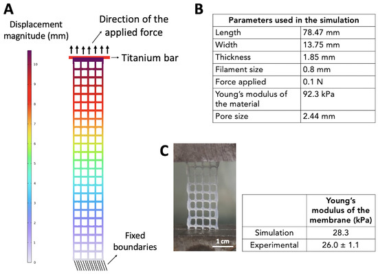 In the model employed for the simulations, we assumed that membranes were purely elastic and made of isotropic material. To perform the simulations, we needed to determine other properties of the material, including its density, Young’s modulus, and Poisson’s ratio. We determined the Young’s modulus of the material experimentally through a uniaxial tensile test and validated it through simulations. Additionally, we experimentally measured the material’s density, which was 950 kg/m. Concerning its Poisson’s ratio, we used a value of 0.45 since it falls within the range of what is expected for hydrogels [19] and is similar to that of rubber and rubber-like materials (such as several hydrogels [20]), which is of 0.5. For the simulations, we considered the membranes as fixed on the bottom and attached to a titanium bar on the top, on which the tensile force was exerted. The displacement of the titanium bar was limited to the longitudinal direction to avoid the deformation of membranes in other directions during the tensile test. The tensile test was then simulated by pulling up the titanium bar at a given force, which was too low to deform the bar. The simulation was performed either by applying the maximum force used for the calculation of the experimental Young’s modulus for vertical and horizontal membranes or fixed at 0.1 N when using the simulation to predict the Young’s modulus of membranes.