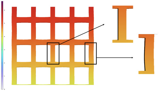 The geometrical models of membranes used for the simulations of the tensile tests were built on COMSOL Multiphysics (Stockholm, Sweden) software and were based either on the dimensions of the experimentally 3D-printed membranes or on the above mentioned theoretical calculations (Section 2.1.6). Based on the purpose of the simulation, the geometry was created according to two different methods. To determine the Young’s modulus of both the membranes and the material, we reproduced the geometry of the the five membranes with vertical and horizontal orientations of the pores (labeled V1 to V5 and H1 to H5, respectively). The dimensions of the membranes (size of the filaments, thickness, width, and length of membranes) were determined experimentally and are summarized in Table S1 (Supplementary Information). For each simulation, the filament size was 0.8 mm and the thickness of the membranes was 1.85 mm (both measured experimentally). The size of the pores were calculated as percentages of the theoretical CAD design (taking into account the shrinkage of membranes).