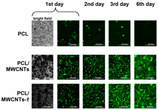 Tissue engineering emerged years ago as a result of the discovery of new and advanced biomedical substitutes capable of replacing, maintaining, or even improving damaged tissue functions. CNTs are not toxic to human osteoblasts at low concentrations, according to research. More significant, Koodziej et al. prepared both of PCL/MWCNTs-f and PCL/MWCNTs by reinforced CNTs with polymer nanocomposites for biomedical application. They reported that the produced materials have better cell adhesion and allowing cells to grow on scaffolds [123]. To determine the nature of the cell–material interactions, they used 2D Raman correlation spectroscopy. In a cell proliferation assay, both substances were suitable to be biocompatible and osteo-inductive. Figure 2 displays fluorescence micrographs that showed the cell populations increase with time for both nanocomposite materials. As a result, the incorporation of CNTs is critical in improving the biocompatibility of these materials. In addition, the authors discovered that PCL/MWCNTs-f is more suitable for osteoblast adhesion and causes more progressing variations in the proteins of cultured cells than PCL/MWCNTs.