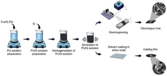 Tissue regeneration still enables the construction of outstanding intelligent biomaterials. Multiple studies on PU/G composites for biomedical engineering have recently been published. Bahrami et al. [139] used two separate fabrication techniques to create the PU/multilayer graphene flakes as membranes as shown in Figure 5: electrospinning and solvent casting. The results confirmed that electrospinning achieved a better distribution of graphene into the PU matrix than solvent casting. Cellular studies revealed that the PU/G composites increased cell adhesion and proliferation while remaining non-toxic. The existence of graphene on the surface of PU composites mended cell behavior. More particularly, graphene reduces fiber diameter, resulting in a bigger surface area for gripping proteins and more binding sites for cell membrane receptors. Graphene appeared to increase surface roughness, increasing the number of sites suitable for cell embedment. Sensors based on polymer-modified electrodes are used to quantify pharmaceuticals and related compounds. Because of its biocompatibility and good physical properties, polyurethane foam (PUF) is an important type of biopolymer.