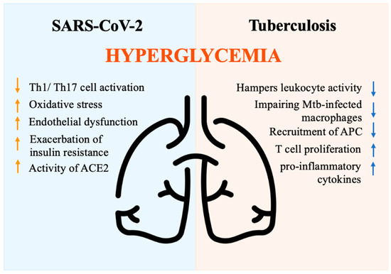 Figure 4. Immune response driven by hyperglycemia during SARS-CoV-2 and tuberculosis infections. ACE2 (Angiotensin-converting enzyme 2), APC (Antigen-presenting cells), Mtb (Mycobacterium tuberculosis bacilli), Th1/Th17 (Lymphocytes T helper 1 e 17), Icon design by icons8.