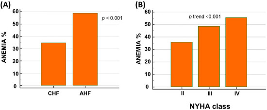 The patients with AHF showed significantly lower haemoglobin levels (13.2 ± 2 vs. 12 ± 2 g/dL, p < 0.001). The AHF patients demonstrated a higher prevalence of anaemia as compared to the CHF ones (Figure 1A). Specifically, the higher the NYHA functional class (i.e., the worse the HF condition of the patient), the higher the prevalence of anaemia (Figure 1B).