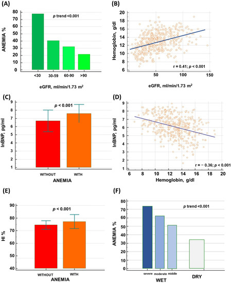 The relationship between renal function and anaemia occurrence in HF has been explored. Figure 2A,B outlines a higher prevalence in anaemic patients with eGFR deterioration (r = 0.41; p < 0.001).
