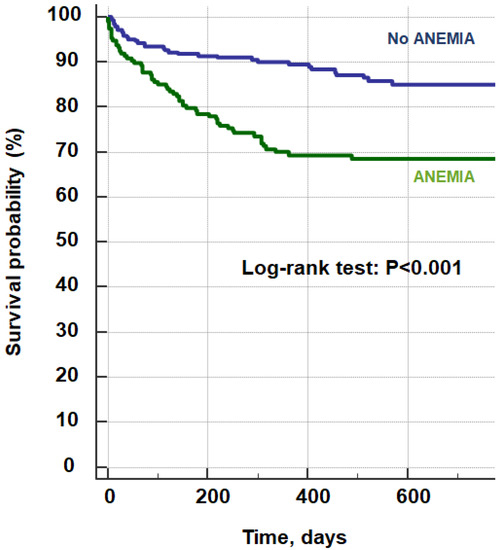The analysis of ROC curves identified haemoglobin ≤11.9 g/dL (AUC = 0.66, sensitivity 61%, and specificity 72%, p < 0.001) as the cut-off for the discrimination of mortality risk. Kaplan–Meier analysis indicated a significant increase in all-cause mortality in the anaemic group patients (Figure 3).
