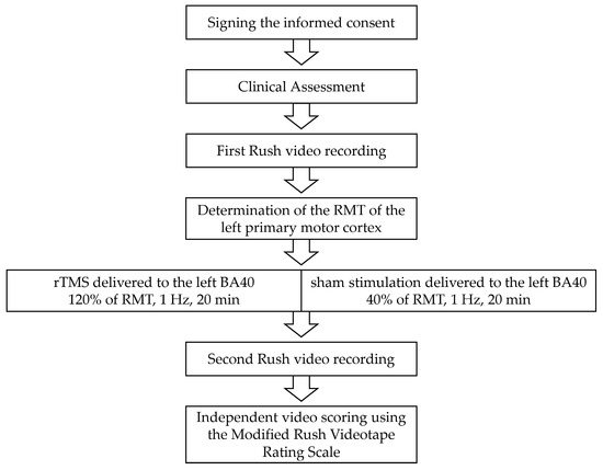 After completion of the clinical assessment, including the first Rush video recording, the participant was seated in a comfortable chair, and the head was placed on a chin rest to minimize head movements and maintain the rTMS coil position during stimulation. Participants were instructed to relax.