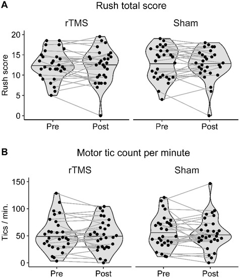 Illustration of Rush total scores and tic counts per minute. Pre- and post-rTMS (A) Rush total scores and (B) motor tic counts per minute of all participants in the rTMS and the sham stimulation condition are shown. The horizontal line in each violin plot denotes the median.