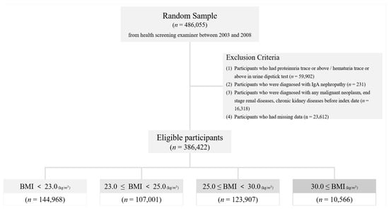 To diminish any potential effects, participants who underwent health screening in 2002 were excluded. The results on the presence of hematuria by urine dipstick were collected until 31 December 2008. In total, 486,055 participants who underwent their first health screening from 1 January 2003 to 31 December 2008 were included in this study. The follow-up period was from 1 January 2003 to 31 December 2015. Individuals who (1) had proteinuria/hematuria, trace or above, by urine dipstick (n = 59,902); (2) were diagnosed with recurrent and persistent hematuria in glomerular disease (10th edition of the International Classification of Diseases [ICD-10] codes N02.0–N02.8) (n = 231); (3) were diagnosed with malignant neoplasia (ICD-10 codes C), CKD, or ESRD (ICD codes N180, N181, N182, N183, N184, N185, N189) (n = 16,318); and (4) had missing data for age, sex, BMI, or other variables (n = 23,162) at the time of enrollment were excluded. Finally, 386,422 participants were included. The data management is described in Figure 1.