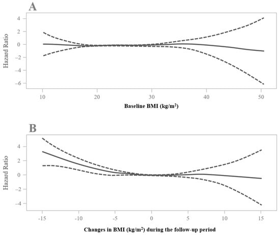 Cox proportional hazard spline curves showing associations between recurrent and persistent hematuria in glomerular disease and (A) baseline BMI (kg/m2) and (B) changes in BMI (kg/m2) during the follow-up period. BMI, body mass index.