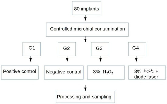 The research was conducted at the Department of Oral Surgery of the School of dental medicine in Zagreb and at the Clinical Institute for Clinical and Molecular Microbiology of KBC Zagreb, Croatia. Eighty Zimmer Biomet Tapered Screw-Vent MTX 4.1/10 mm titanium implants (Zimmer Biomet, Palm Beach Gardens, FL, USA) were used in the study. According to Ehrenfest et al. [22], these implants are grade 5 titanium core, with a surface modified by sand-blasting (resorbable blasting media—RBM like calcium phosphate). The surface was microrough, nano-smooth and homogenous. The implants used in this study were contaminated with cultures of S. aureus and C. albicans isolated from clinical samples at University hospital centre Zagreb. Bacterial and fungal strains were grown separately on Columbia agar for 72 h, after preparation of separate bacterial and fungal suspensions using a thioglycolate broth. They were then mixed into a common suspension. An optical densitometer (Densimat, Biomerieux, Marcyl’Etoile, France) determined the density at 600 nm, which corresponded to 1 × 108 CFU/mL. All dental implants were immersed in 0.3 mL of mixed bacterial–fungal suspension for 14 days under aerobic conditions, at a temperature of 35 °C. The suspension was contained with S. aureus and C. albicans, at a density of 0.5 McFarland. After that, all implants were randomly distributed into four groups, so that there were 20 implants per group (Figure 1). The implants were removed from the test tubes with sterile tweezers. The implants were then put on sterile gauze and, depending on which group they were in, went through the right cleaning process.