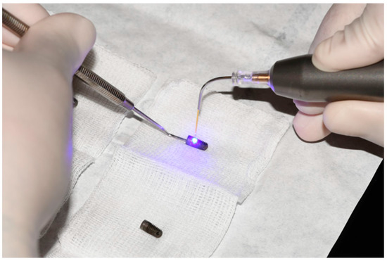 The fourth group (G4) underwent the same procedure as G3, with the following difference: 60 s after treatment with 3% hydrogen peroxide, the samples were illuminated with a SiroLaser Blue laser (Dentsply Sirona, Bensheim, Germany) with the following parameters: wavelength of 445 nm, power of 1 W, continuous beam (CW), 320 mm laser fiber tip and 60 s exposure time (Figure 2). The distance of the laser tip from the implant surface was approximately 1–2 mm, with a constant movement of 1 mm/s along the implant surface (freehand movement).