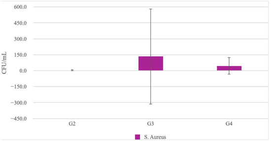 Descriptive statistics of CFU/mL for all protocols for S. aureus are shown in Table 1. In the negative control, the highest proportion of colonies per mL was present at 2.86 × 108, followed by the group disinfected with hydrogen peroxide (G3) with 134 CFU/mL, the group of laser-activated hydrogen peroxide (G4) with 45 CFU/mL, and the positive control (G2) with the smallest proportion of 4 CFU/mL. Differences between groups (Mann–Whitney U test) are shown in Table 2 and graphically in Figure 7.