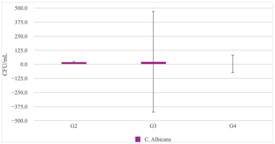 Descriptive statistics of CFU/mL for all protocols regarding C. albicans are shown in Table 3. In the negative control, the highest proportion of colonies per mL was present at 4.06 × 105, followed by the group disinfected with hydrogen peroxide (G3) with 24 CFU/mL, the positive control (G2) with 20 CFU/mL, and the laser-activated hydrogen peroxide group (G4) with the smallest proportion of 5 CFU/mL.