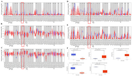 PLINs family members’ mRNA expression in pan-cancer. (A–E) Expression levels of perilipin members (PLINs) gene in pan-cancer according to TIMER2.0 database. * p < 0.05; ** p < 0.01; *** p < 0.001. (F) Expression levels of PLINs gene in tumor and normal tissues based on UALCAN database.