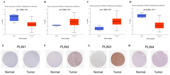 The levels of protein expression of PLINs in GBM. (A–D) In the CPTAC database, PLIN2/PLIN3 had increased protein levels in GBM and PLIN1/PLIN4 had decreased protein levels in GBM compared to normal tissue. (E–H) Protein expression of PLINs from the HPA database.