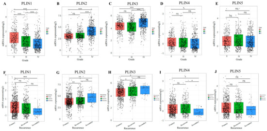 Correlation analysis of PLINs and clinical features of glioma. (A−E) The mRNA expression levels of PLIN1-5 in different glioma World Health Organization classifications (* p < 0.05; ** p < 0.01; *** p < 0.001, ns: no significance) (F−J) Comparison of mRNA expression levels of PLIN1−5 in primary, secondary, and recurrent glioma.