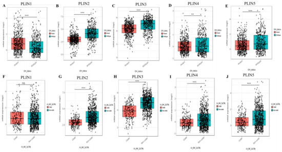 PLIN2 and PLIN3 are widely distributed in various tissues and cell types, PLIN1 and PLIN4 are present in adipocytes, and PLIN5 is usually highly expressed in skeletal muscle, liver, and brown fat [13,14]. The PLINs family has been studied in metabolism-related diseases such as hepatic steatosis, cardiovascular diseases, and diabetes [15,16,17]. Perilipins are considered a biomarker of sebaceous gland epithelial cells and myoepithelial cell carcinogenesis in parotid cancer [18]. It has also been demonstrated that PLIN1, PLIN2, and PLIN3 are co-expressed in hepatocellular carcinoma [19]. PLIN4 mutations have been identified in gastric and lung cancers and are associated with poor prognosis [20]. Zhang et al. [21] showed that PLIN3 is highly expressed in breast cancer while PLIN1/2/4/5 show low expression in breast cancer and PLIN1 and PLIN2 are associated with prognosis in breast cancer patients. However, the clinical significance and potential function of the PLINs family in glioma are poorly understood.