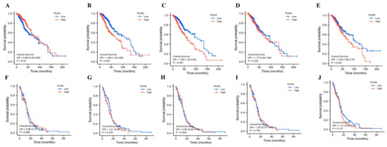 Prognostic value of PLINs family in gliomas. (A–E) Overall survival analysis of PLIN1-5 mRNA high and low expression in LGG. (F–J) Overall survival analysis of PLIN1-5 mRNA high and low expression in GBM.
