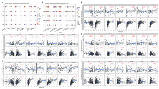 The correlation of PLINs expression with the level of immune infiltration in GBM and LGG was investigated through GSCA and TIMER databases. We then used the Sangerbox website to evaluate the relationship between PLINs expression and ESTIMATScore, StromalScore, and immuneScore in GBM and LGG. According to the previous study, we selected 58 of two types of immune checkpoint markers [32,33]. The expression of these checkpoints in different cancers was extracted from the TCGA database, and the normal samples were filtered. The relationship between the expression of immune checkpoint-related genes and PLINs in gliomas was calculated by Pearson correlation analysis.