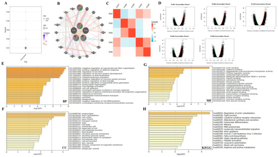 Analysis of drug sensitivity-associated genes and biological functions of PLINs family. (A) Drug sensitivity analysis of PLINs family. (B) The PLINs gene interaction network and related functions were obtained by GenMANIA analysis. (C) Heat map of the correlation between the members of the PLINs family. (D) Volcano maps of PLINs family members with co-expressed genes in LGG. (E–H) GO enrichment of PLINs family members in LGG and KEGG pathway analysis. GO: Gene ontology.
