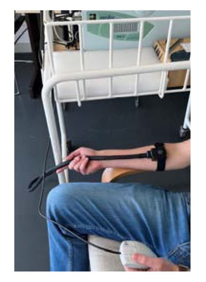 Thermal stimuli were delivered by using a computerized thermal stimulator TSA II (Medoc, Ramat Yishay, Israel), with a standard 30 × 30 mm TSA II thermode, onto the ventral surface of the nondominant forearm of the volunteer (Figure 1). Care was taken to ensure the best contact between the probe and the forearm surface. Sessions were conducted by a previously trained researcher and held in a closed-door room, with a controlled temperature, to avoid interruptions. All subjects declared themselves thermally comfortable at the beginning of the experiment. Before initiation of the testing, participants received a detailed explanation of the process and signed an informed consent. The stimulus intensity rating was obtained through the 11-point numeric rating scale (NRS) [,,].