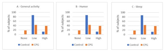 Impact of pain in the control group and CPG (% of subjects per level of interference). (A) Level of interference with general activity, (B) level of interference with humor, and (C) level of interference with sleep. CPG, chronic pain group. Visual inspection of the bar charts indicates a higher interference in the CPG (no statistical differences in Chi-square test).