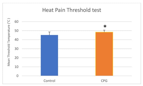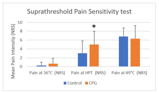 Comparison of mean ± SD pain sensitivity in suprathreshold tests in the control group and the CPG (NRS at 36 °C, mean heat pain threshold, and 49 °C) using Mann–Whitney U test (* p < 0.05). HPT, heat pain threshold; NRS, numeric rating scale; SD, standard deviation. The results for the suprathreshold tests demonstrated significant differences between the control group and the CPG at HPT but not at 36 °C or 49 °C (Mann–Whitney U test).