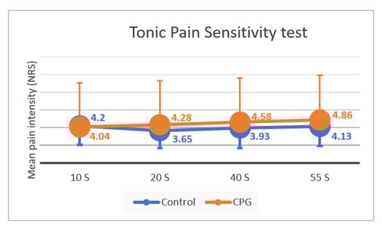 Intensity of pain perception throughout the tonic stimulus (10, 20, 40, and 55 s) in the control group and in the CPG, with standard deviation bars (mean ± SD). NRS, numeric rating scale; SD, standard deviation; CPG, chronic pain group. There were no significant differences in NRS during the tonic stimulus between the control group and the CPG (Friedman test).