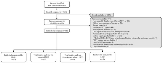 This systematic review considered studies that included adults (as defined by the authors) with any of the following inoperable or metastatic SSTR-positive NETs: PPGL, thymic NET, bronchial NET, NET of unknown primary origin, or MTC. Studies that included multiple NET types were only included if the results and baseline characteristics were provided for individual NETs. Studies that included both pediatric and adult patients were retained, if it was possible to extract data for adults only.