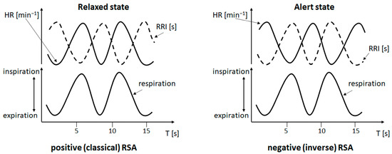 General Background: The term “respiratory sinus arrhythmia” (RSA) denotes a physiological phenomenon based on entrainment between cardiovascular and breathing rhythms. Typical RSA is characterized by a shortening of cardiac beat-to-beat intervals (RRI), i.e., increase in heart rate (HR) during inspiration and RRI prolongation (HR decrease) during expiration [1,2]. RSA is the main part of high-frequency (HF) heart rate variability (HRV) and is often termed as HRV in synchrony with respiration [3,4]. For a long time, RSA has been considered to represent respiration-driven vagally mediated HR modulation [5], thus serving as an index of parasympathetic tone. The low-frequency (LF) component is considered to be a product of both sympathetic and parasympathetic activities [6]. Consequently, the relation of LF to HF HRV has been used as a measure of sympatho–vagal balance [7,8,9].