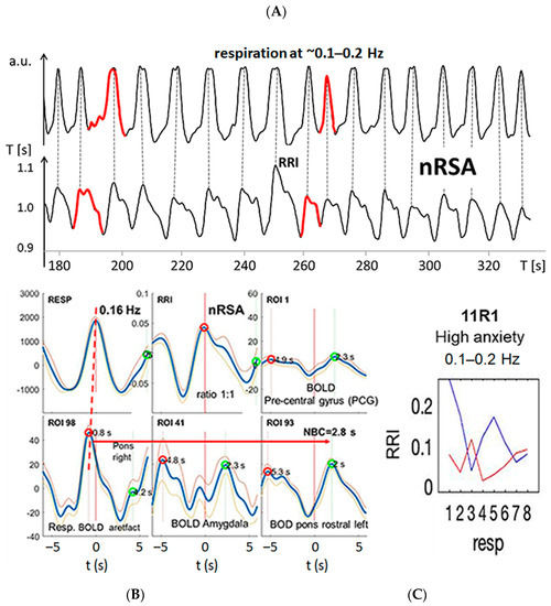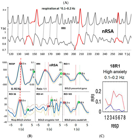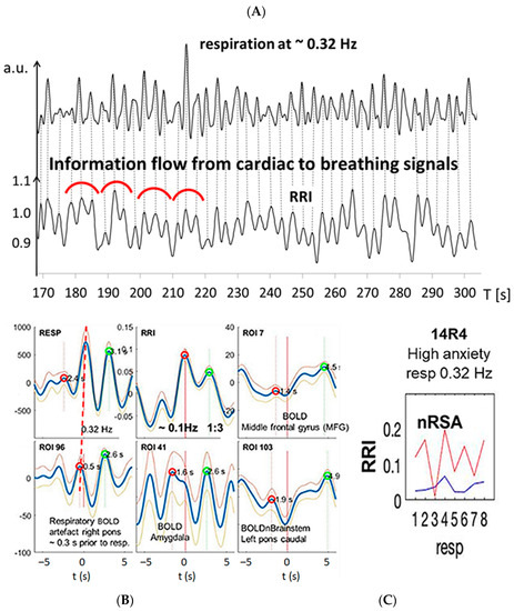 Figure 3 and Figure 4 exhibit characteristic examples of RRI peak-triggered averaged RRI, breathing and BOLD waves. Both figures have in common that they represent subjects with nRSA showing slow neural BOLD waves in the brainstem and PCG as well as slow BOLD waves with superimposed fast wavelets in the amygdala (ROI 41). However, there exists an interesting difference. Subject #18, on the one hand, presented a strong information flow from RRI to the respiratory signal (Figure 4C) and from the MFG to respiration and brainstem (not shown). On the other hand, in subject #11, the information flow from respiration to RRI was dominant (Figure 3C) and also the flow from brainstem to the PCG (not shown). It is speculated that in the former case (#18R1), nasal breathing was predominant, while in the latter case (#11R1), a second possible pathway was active. This second pathway is thought to originate from the preBötzinger complex and to project to the suprapontine nuclei (via the locus coeruleus in the pons and olfactory nuclei [71] as well as to the central medial thalamus, which is directly connected to the limbic and sensorimotor cortical areas [72]. The nasal route of breathing seems to have particular importance for breathing-entrained oscillations [37,73,74,75] as is discussed in more detail below. Further research is necessary to specifically study the importance of nasal breathing for the management of anxiety.