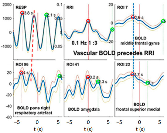 The BOLD signal is a complex signal composed of three interacting components: (i) cerebral metabolic rate of oxygen consumption (CMRO2) due to neural activation, (ii) cerebral blood flow (CBF, Mayer waves) and (iii) cerebral blood volume (CBV). Changes in BOLD signals only reflect neural activity (neural BOLD) accurately if vascular components (CBF, CBV) are not altered [34]. In contrast, the classical neurovascular coupling (NVC) reflects the close temporal and regional linkage between neural activity and cerebral blood flow (CBF) [34,35], whereby cerebral autoregulation, the intrinsic dynamic ability of cerebral vessels to maintain CBF despite fluctuations in arterial blood pressure, plays a dominant role. The evidence of such blood pressure oscillations on BOLD fluctuations is not completely clear and needs further research. In this respect, studies on the interaction of cerebrovascular and cardiovascular variability are important [36]. Neural BOLD oscillations lag behind RRI oscillations, and the time delay between the two oscillations is positive (pTD). Vascular BOLD oscillations lead before RRI oscillations, and the time delay between the two oscillations is negative (nTD) [33]. Cardiovascular and respiratory functions are involved in a multitude of interactions with cortical activities including the limbic brain areas such as the amygdala and hippocampus, regions related to regulation of emotions [23,24,37,38]. The directional interactions between the heart rate and respiration revealed that the influence is much stronger from the respiratory to the cardiac rhythm than in the opposite direction [39,40,41,42,43]. The direction of coupling between the heart rate and respiration may be reversed in some pathological states or during sleep [44,45].