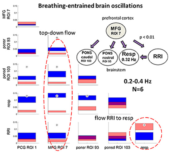 The most interesting part in this group is the highly significant information flow from MFG to the brainstem, to respiration and to RRI signals in the 0.2–0.4 Hz band (see Figure 7). Such a directed flow is characteristic for brain rhythms in the 0.1–0.2 Hz band entrained by nasal respiration and was recently reported and discussed [48]. The present results demonstrate that respiratory entrainment of brain rhythms is not confined to the 0.1–0.2 Hz band but also exists in the 0.2–0.4 Hz band.