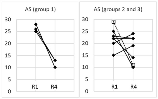 AS values obtained from all 10 subjects in sessions R1 and R4. In the interest of greater clarity, the subjects of group 1 are presented in the left panel and the subjects of groups 2 and 3 in the right panel. Subject #6 (group 3) is marked as ☐- - -☐.