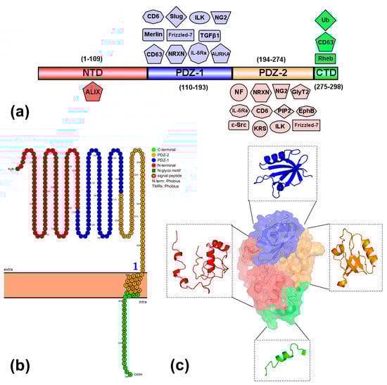 Structure and domains of syntenin-1. (a) The linear structure of syntenin-1 (access number NCBI: NP_001007068.1) shows the four structural domains and their localization (aa): N-terminal domain (NTD), PDZ1 and PDZ2 domains, and C-terminal domain (CTD). Protein and multiprotein complexes associated with each domain are also illustrated. NTD: ALIX (ALG-2-interacting protein X); PDZ1: NRXN (Neurexins), Merlin, CD6 (Cluster of differentiation 6), IL-5Rα (Interleukin-5 Receptor alpha), CD63, NG2 (Neural/glial antigen 2), Fzd7 (Frizzled 7), ILK (Integrin-linked kinase), Slug, TGFβ1 (Transforming growth factor beta 1), and AURKA (Aurora Kinase A); PDZ-2: NF (Neurofascin), NRXN (Neurexins), Syndecan, GlyT2 (Glycine transporter 2), IL-5Rα (Interleukin-5 Receptor alpha), c-Src (Proto-oncogene tyrosine-protein kinase Src), KRS (Lysyl-tRNA Synthetase), PIP2 (Phosphatidylinositol 4,5-bisphosphate), NG2 (Neural/glial antigen 2), Fzd7 (Frizzled 7), EphB (Ephrin B), and ILK (Integrin-linked kinase); CTD: Rheb (Ras homolog enriched in brain), CD63, and Ub (Ubiquitin). Created in IBS (Illustrator for Biological Sequences: http://ibs.biocuckoo.org/, accessed on 4 February 2023). Schematic representation of the 2D (https://wlab.ethz.ch/protter/, accessed on 5 February 2023) (b) and 3D structure (c) of syntenin-1. In red: NTD (1–109 aa); blue: PDZ1 (110–193 aa); orange: PDZ2 (194–274 aa); and green: CTD (275–298 aa). In the 2D structure (b), the extracellular, transmembrane, and cytoplasmic domains are shown, whereas, in the 3D structure (c), the surface and alpha helix/β-sheets are illustrated. The 3D structure was obtained by ab initio structure modeling in the server RaptorX (http://raptorx6.uchicago.edu/, accessed on 5 August 2022).