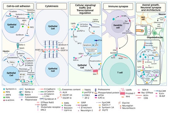 Biological functions of syntenin-1. The expression of syntenin-1 allows cell-to-cell adhesion by the interaction with molecules such as Delta-1, E-cadherin, TRAF6, and PIP2. Syntenin-1 participates in the signaling and cellular traffic, along with proTGF-α. For transcriptional regulation, syntenin-1 interacts with Frizzled-7, PIP2, IL5RA, and Wnt, whereas, for cytokinesis, interacts with molecules such as ALIX and syndecans. During the immune synapse, syntenin-1 relates with ALCAM and ezrin; finally, in the neuronal synapse, syntenin-1 interacts with neurexin, neurofascin, GlyT2, glutamate receptors, and beta Ephrin. Image created in BioRender (www.biorender.com, accessed on 14 February 2023).