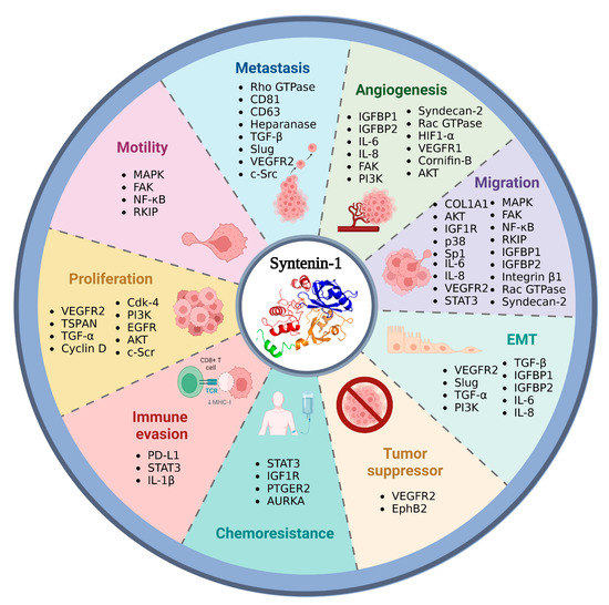 Overexpression of syntenin-1 and cancer development. The overexpression of syntenin-1 is related to angiogenesis (IGFBP1, IGFBP2, Rac GTPase, PI3K, Syndecan-2, HIF1-α, and SPRR1B), metastasis (TGF-beta, Rho GTPase, Slug, c-Src, Heparanase), migration (COL-1, AKT, MAPK, p38, SP1, and Syndecan-2), EMT (TGF-beta, VEGFR, IL6, and IL8), chemoresistance (STAT3, IGF-1R, PTGER2, and AURKA), proliferation (Cdk-4, TSPAN, Cyclin D, TGF-alfa, and s-Src), and motility (MAPK, FAK, NF-kB, and RKIP), also shows a tumor suppressor role by its interaction with VEGFR2 and EphB2. Image created in BioRender (www.biorender.com, accessed on 14 February 2023).