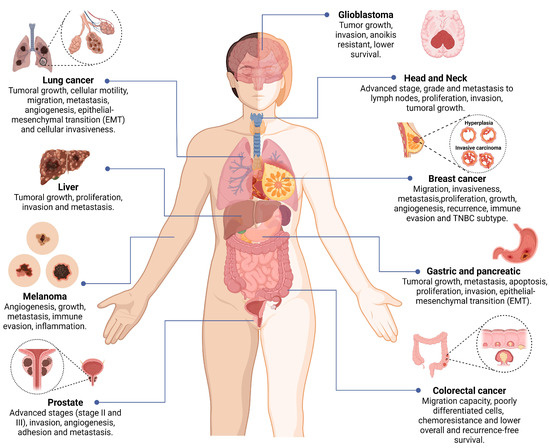 Role of syntenin-1 in the development of different types of cancer. The overexpression of syntenin-1 has been associated with the progression of several cancers by promoting tumor growth, migration, invasion, immune response evasion, proliferation, angiogenesis, and metastasis. Additionally, it has been associated with advanced stages, overall survival, and recurrence. Tumors with an overexpression of syntenin-1 include melanoma, prostate, colorectal, and breast cancer, followed by glioblastoma, gastric, pancreatic, liver, and HNSCC. Image created in BioRender (www.biorender.com, accessed on 14 February 2023).