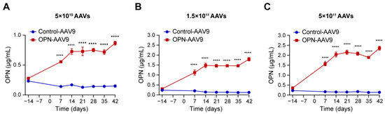 In order to achieve a sustained increase in circulating OPN (cOPN) expression, we used an adeno-associated virus (AAV)-based transduction approach. AAV9 viruses expressing either OPN or empty vector were injected intravenously into mice at different titres and the levels of OPN in the plasma were monitored at regular intervals after transduction. All tested titres led to a significant increase in the circulating levels of OPN, already one week after transduction with OPN-AAV9, compared to mice injected with control viruses. At 2 weeks, the levels reached a plateau, with only moderate further increase until day 42 (Figure 1A–C).