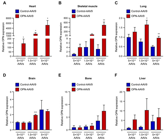 AAV9 vectors have been described as having a relatively broad tropism to various organs of the body including the lung, liver, skeletal muscle, heart and central nervous system [50]. To assess which organs had been targeted by OPN-AAV9 in our system, we determined OPN levels in different organs following viral transduction. The strongest and most robust upregulation of OPN levels at all titres was achieved in the heart (Figure 2A). None of the other organs that were examined showed a significant increase in OPN at the lowest titre of 5 × 1010 viral particles per animal (Figure 2B–F). At higher titres, a significant increase was also observed in other organs including skeletal muscle (Figure 2B), lung (Figure 2C) and brain (Figure 2D).
