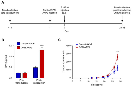 For the spontaneous metastasis experiments, female C57BL/6JOlaHsd mice were purchased from Envigo (Horst, Netherlands) at the age of 5 weeks and acclimated for 1 week prior to the first blood draw at day −14. Two weeks after the first blood sample was collected (day 1), mice were first injected i.v. with 5 × 1010 viral particles in 100 µL DPBS of either OPN-AAV9 or control-AAV9. They were injected 6 days later with 100,000 B16F10 melanoma cells (confirmed shortly before injection to be mycoplasma negative) in 100 µL DPBS subcutaneously (s.c.) into the flank. Tumour size was measured with a caliper. As soon as it reached the maximum permitted diameter of 2 cm (day 28–33), blood, axillary lymph nodes and lungs were collected for analysis. Metastases on the surface of the lungs were counted under a stereo microscope. Tumour and lymph node volumes were calculated using the formula V = L × W × D/2, where L is length, W is width and D is depth.