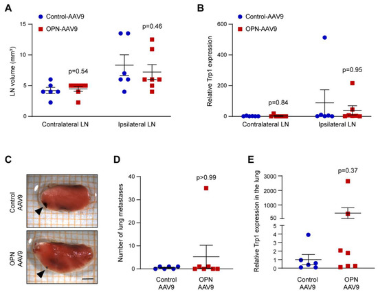 An increase in cOPN does not enhance melanoma lymph node and lung metastasis. Mice were transduced with control-AAV9 and OPN-AAV9 at 5 × 1010 viral particles, then injected with B16F10 melanoma cells s.c. At the end point, axillary lymph nodes were analysed. (A) Volume of contralateral and ipsilateral axillary lymph nodes (LN). (B) Expression of the melanoma marker Trp1 in contralateral and ipsilateral axillary lymph nodes measured by qPCR. (C) Representative images of B16F10 metastatic nodules in the lungs (indicated by black arrowheads). Scale bar: 2 mm. (D) Number of metastatic nodules in the lungs. (E) Expression of the melanoma marker Trp1 in the lungs. Control and OPN groups were compared using the Mann Whitney test; n = 6 for Control-AAV9 and n = 7 for OPN-AAV9.