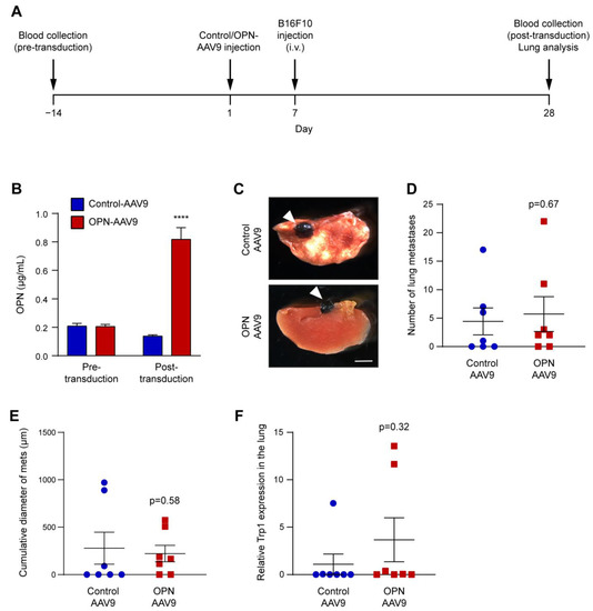For the experimental metastasis experiments, 6 to 7-week-old female C57BL/6J mice were equally divided into 2 groups and blood was collected to determine pre-transduction baseline levels of OPN. After 2 weeks, the mice were first injected i.v. with control-AAV9 or OPN-AAV9 at 5 × 1010 viral particles per animal in 100 µL DPBS (day 1), followed by i.v. injection of 1 × 105 B16F10 melanoma cells in 100 µL DPBS 6 days later. 28 days after AAV9 injection, blood and lung samples were collected.
