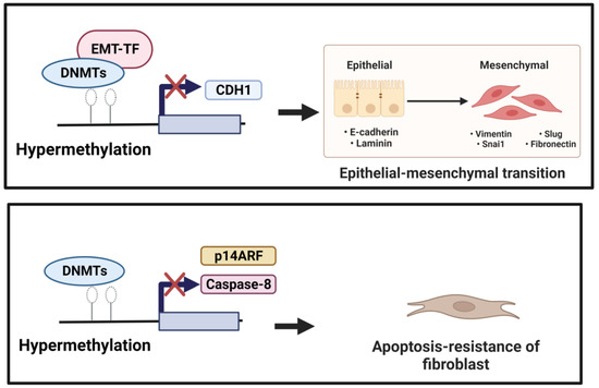 (1) Induction of EMT. Down-regulation of CDH1 (anti-fibrotic factor) is mediated by EMT-TF, which recruits DNMTs to the CDH1 promoter performing focal hypermethylation of the CpG islands in the CDH1 promoter, leading to decreased gene expression of CDH1. (2) Reduction in apoptotic activity. Hypermethylation mediated by DNMTs of the pro-apoptotic factors, including Caspase 8 and p14 ARF, could underlie resistance to fibroblast apoptosis.