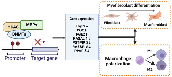 DNA methylation regulate myofibroblasts and macrophages. The methylation of promoter DNA can repress gene expression by MBPs, recruiting specific macromolecular complexes that contain histone deacetylases (HDAC), DNMTs, and other transcriptional co-repressors (Co-Rep). Several genes that function as an anti-fibrotic and are associated with myofibroblast differentiation and macrophage M2 polarization have been shown to undergo silencing due to DNA hypermethylation.