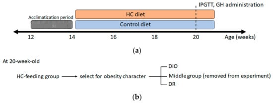 Forty-seven male Wistar rats, aged 12 weeks, from the National Laboratory Animal Center at Mahidol University, were used for this study. The study protocol was approved by the Institutional Animal Care and Use Committee (IACUC), Faculty of Veterinary Science, Chulalongkorn University (approval protocol number #1531026). Animals were individually housed in conventional hanging cages with stainless steel wire mesh floors (33 cm × 18 cm × 20 cm) under standard conditions in a temperature-controlled room (12 h/12 h light/dark cycle, 22 ± 1 °C). The rats were allowed to access water ad libitum and standard rat chow (#082; Perfect Companion Group Ltd., Samutprakarn, Thailand) containing protein 24 g%, carbohydrate 42 g%, fat 4.5 g%, energy 3.04 kcal/g, and energy from fat 13%. After acclimatization for 2 weeks, they were divided into two main groups. The control group was fed with the standard rat chow (n = 12) and the hypercaloric diet (HC diet) feeding group was given an HC diet (protein 17.52%, carbohydrate 30.66%, fat 30.3%, energy 4.65 kcal/g, energy from fat 60%; n = 35) for 6 weeks. The HC diet was made by combining melting lard and standard rat chow, with a lard/chow ratio of 27 and 73 g%, respectively. At 20 weeks old, HC-fed rats were arranged by increasing body weight (BW); the lowest tertile of BW gainers were identified as diet-resistant (DR) rats (n = 10) which showed a similar final BW as control rats and no obesity was observed. These rats were represented as the group of HC diet control. Diet-induced obesity (DIO) rats (n = 12) showed a higher BW gain, final BW, and body fat mass compared to control rats. The middle BW gainers (n = 13), which did not meet the DR or DIO criteria, were excluded for this experiment. The timeframe of the experiment and the groups of HC-feeding rats are represented in Figure 1a,b, respectively. Then an intraperitoneal glucose tolerance test (IPGTT) was undertaken (see below). The measurements of BW and food intake (FI) (23 h FI, ±0.1 g corrected for spillage) were recorded during the experimental period.